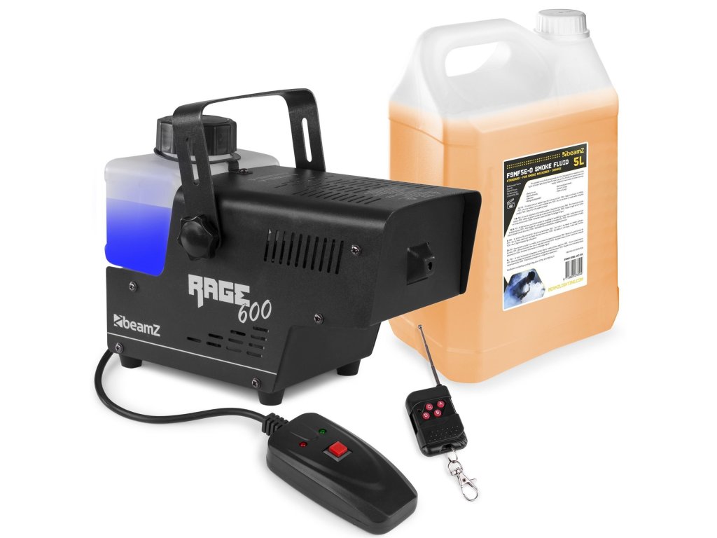 Výhodný set výrobníka hmly s bezdrôtovým diaľkovým ovládačom BeamZ RAGE 600 600W a kvapaliny štandardnej hustoty BeamZ FSMF5E-O 5L.