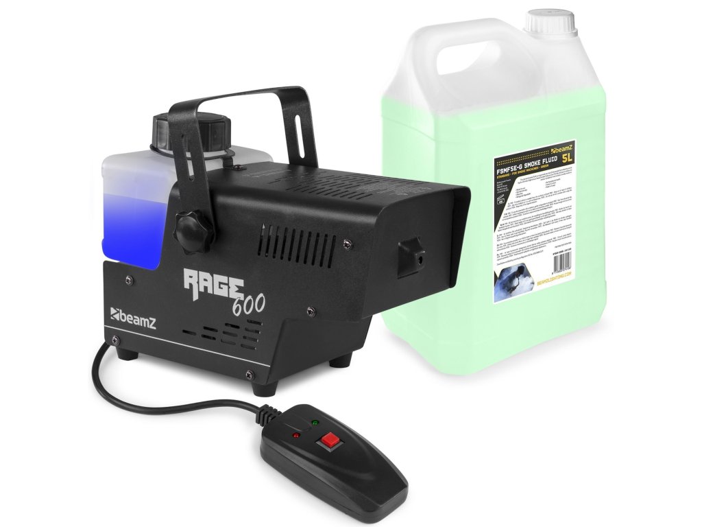 Výhodný set výrobníka hmly BeamZ RAGE 600I 600W a kvapaliny štandardnej hustoty BeamZ FSMF5E-G 5L.