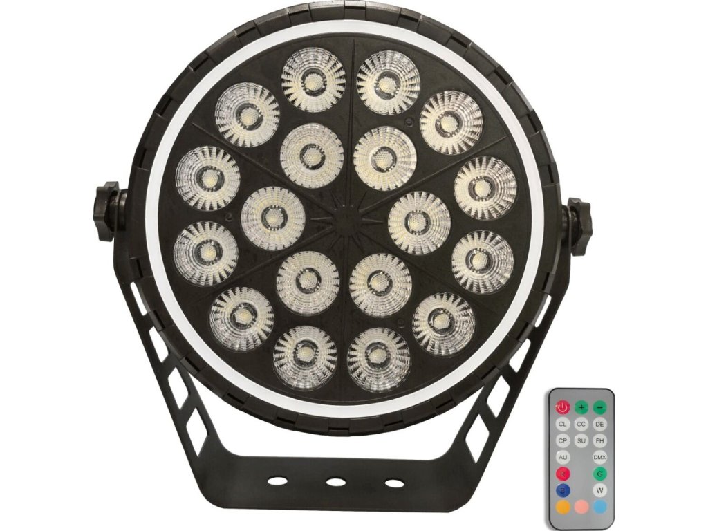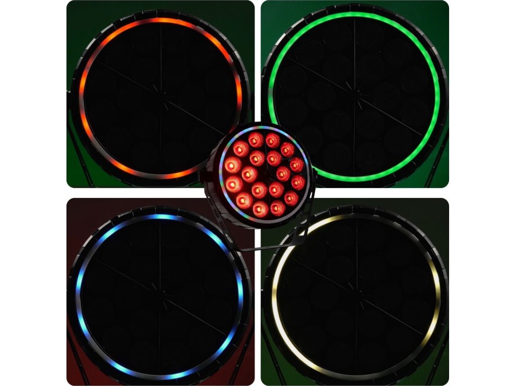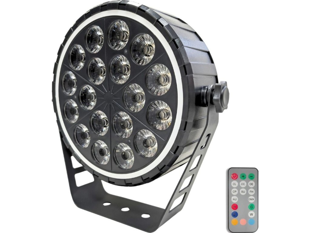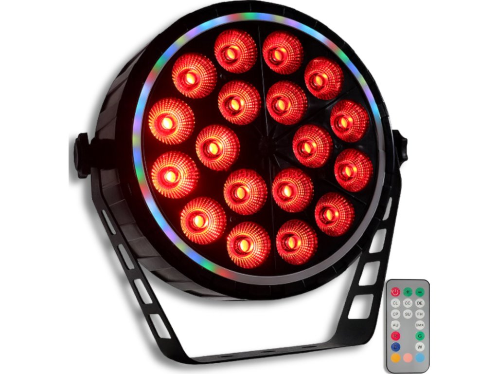 - Typ zariadenia: scénické LED par DMX svietidlo s bezdrôtovým diaľkovým ovládaním a montážnym držiakom- Svetelný zdroj: 18x10W RGBW LED 4v1 + 51x0,3W RGB 3v1 (efekt prstenca)