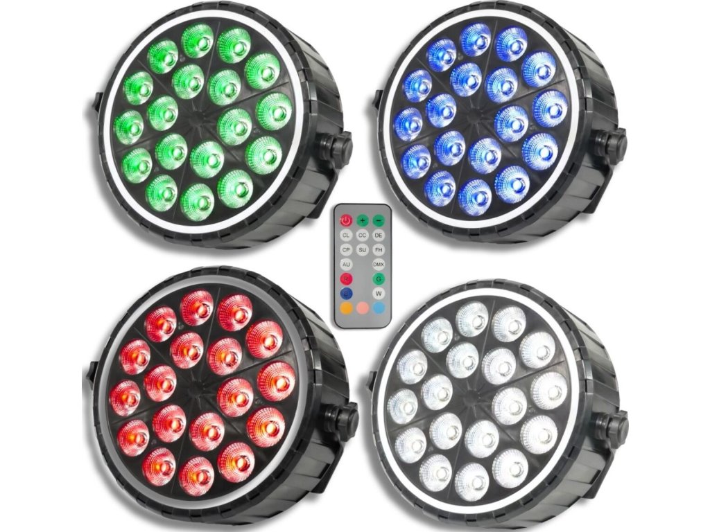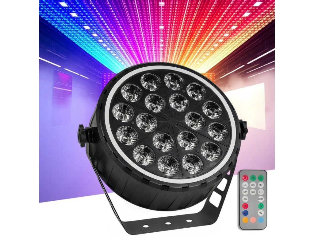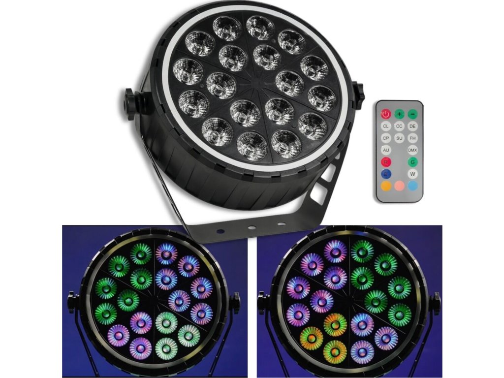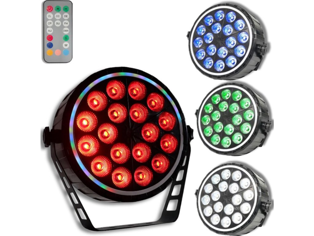 - Typ zariadenia: scénické LED par DMX svietidlo s bezdrôtovým diaľkovým ovládaním a montážnym držiakom- Svetelný zdroj: 18x10W RGBW LED 4v1 + 51x0,3W RGB 3v1 (efekt prstenca)
