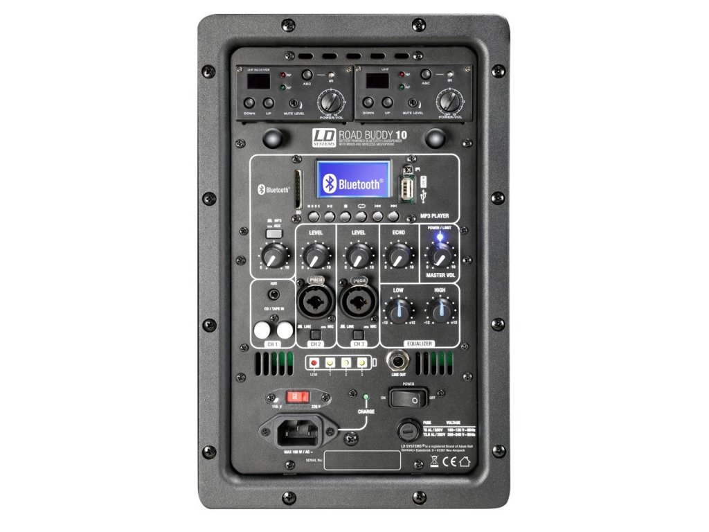 Pre káblové zariadenia má Roadbuddy dva kanály s kombinovanými konektormi a samostatnými regulátormi hlasitosti, ktoré je možné prepínať pre mikrofón a linkovú úroveň, stereofónny vstup cez zásuvky RCA (Cinch) (mono sčítaný) a 3,5 mm Aux vstup. Ovládací panel dopĺňajú regulátory výšok, basov, ozveny a Master.