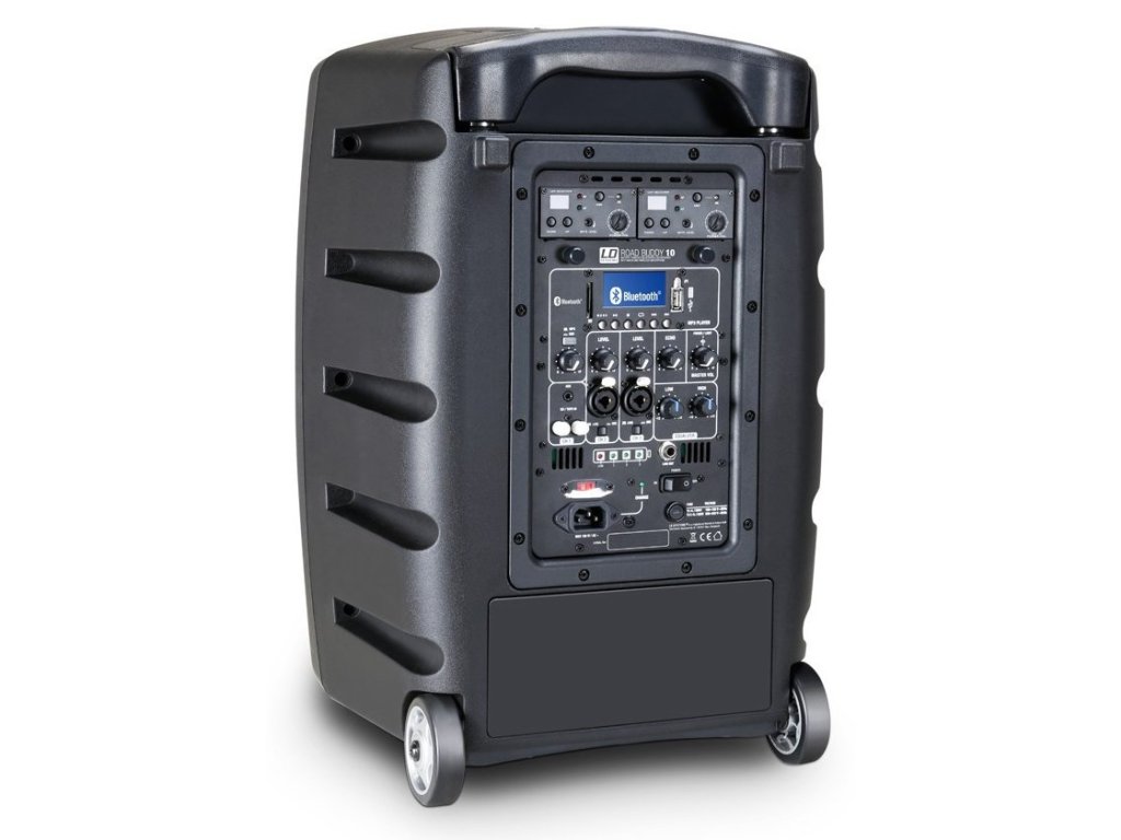 LD Systems Roadbuddy je ľahko prenosný vďaka zabudovaným otočným kolieskam a vyťahovacej rukoväti. Hore je praktický úložný priestor až pre dva ručné vysielacie mikrofóny. Plastové puzdro tohto ľahkého zariadenia bolo skonštruované tak, aby pojalo 35 mm statívový držiak.