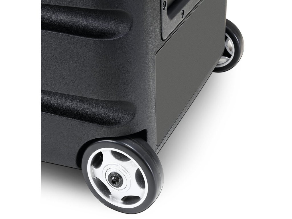 Vďaka zabudovaným kolieskam a teleskopickej rukoväti sa reprobox ľahko preváža a na vrchnom paneli zostal aj priestor pre uloženie až dvoch bezdrôtových mikrofónov.