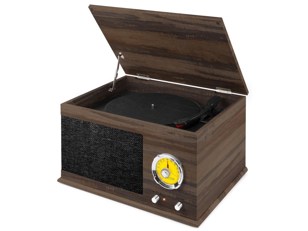 Počúvajte svoj obľúbený vinyl s týmto autentickým gramofónom s vintage dizajnom doplneným dyhou z tmavého dreva. Tento všestranný gramofón podporuje 3 rýchlosti prehrávania (33 1/3, 45 a 78 RPM), čo umožňuje prehrávanie takmer akejkoľvek vinylovej platne. Je vybavený vstavanými reproduktormi, výstupom AUX a vstavaným prijímačom rádia FM na naladenie vašej obľúbenej rozhlasovej stanice. Tento gramofón je plne vybavený všetkou modernou technológiou, ktorú očakávate; integrovaný prehrávač médií BT pre bezdrôtové streamovanie hudby, nostalgické žlté podsvietenie a funkcie automatického zastavenia. Tento báječný gramofón so svojím retro štýlovým vzhľadom v kombinácii s moderným a vysoko kvalitným zvukom sa tento báječný gramofón určite stane ústredným prvkom každej miestnosti.