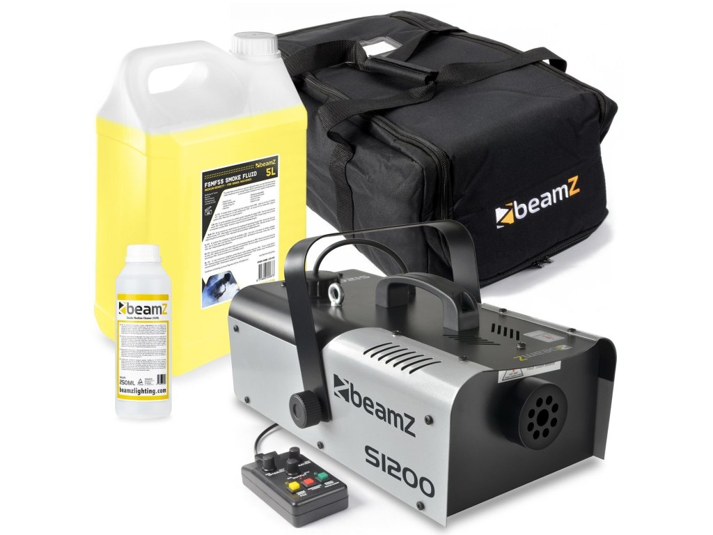 Výhodný set výrobníka hmly BeamZ S1200 MKII 1200W, kvapaliny so strednou hustotou BeamZ FSMF5S (5 litrov), čistiacej kvapaliny BeamZ FSMC a prepravnej tašky BeamZ AC-131.