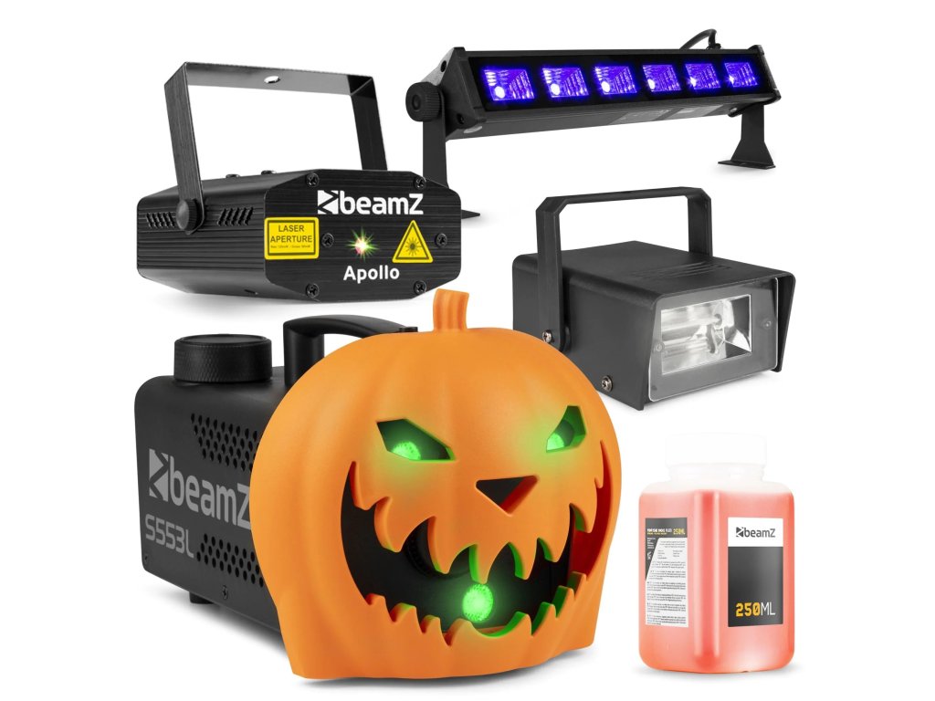 Výhodný set výrobníka hmly BeamZ S553L Halloween Edition 550W s nasadzovacou tekvicovou hlavou, LED svetelnými efektmi a diaľkovým ovládaním, kvapalinou do výrobníka hmly 250ml, UV LED barom BeamZ BUV63 6x3W UV LED, stroboskopom BeamZ BMS50 Mini Strobe a laserom BeamZ Apollo Multipoint Laser zelená / červená.