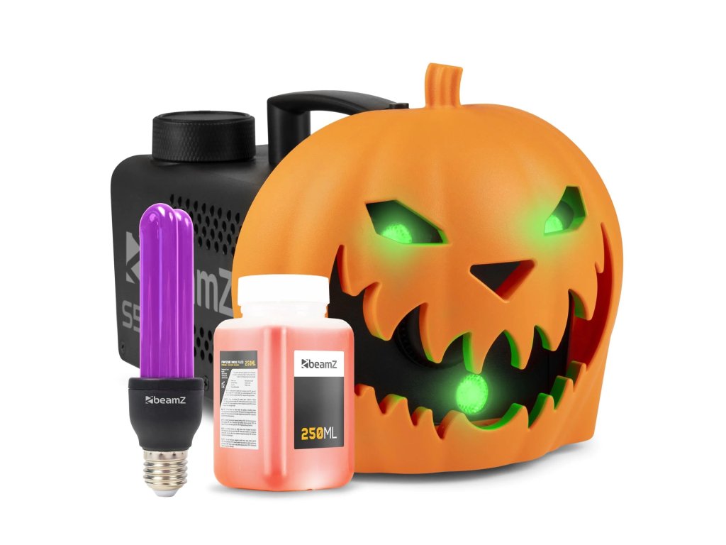 Výhodný set výrobníka hmly BeamZ S553L Halloween Edition 550W s nasadzovacou tekvicovou hlavou, LED svetelnými efektmi a diaľkovým ovládaním, kvapalinou do výrobníka hmly 250ml a UV žiarovkou BeamZ UV 25W E27.