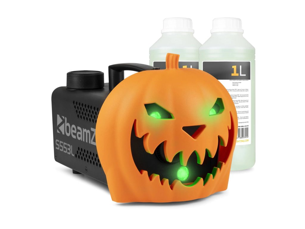 Výhodný set výrobníka hmly BeamZ S553L Halloween Edition 550W s nasadzovacou tekvicovou hlavou, LED svetelnými efektmi a diaľkovým ovládaním a kvapaliny do výrobníka hmly BeamZ FSMF1E-G 2L.
