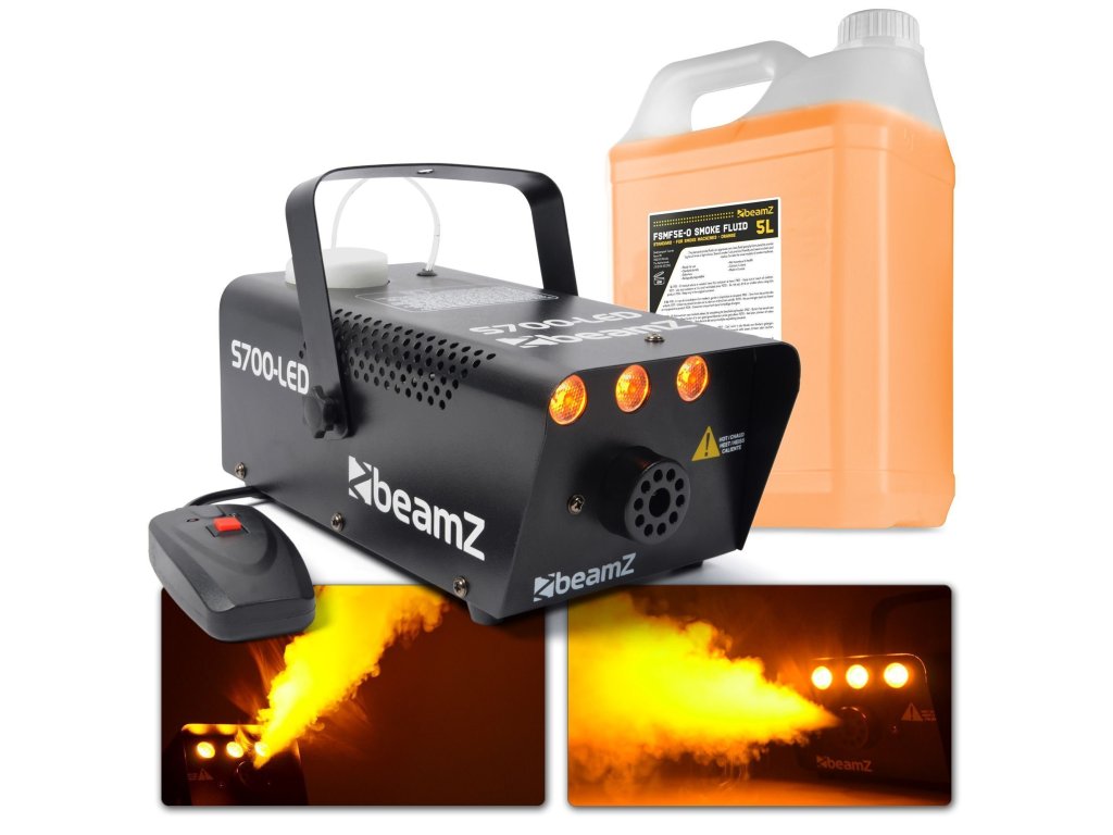 Výhodný set výrobníka hmly s efektom plameňa BeamZ S700-LED 700W a kvapaliny štandardnej hustoty BeamZ FSMF5E-O Orange 5L.