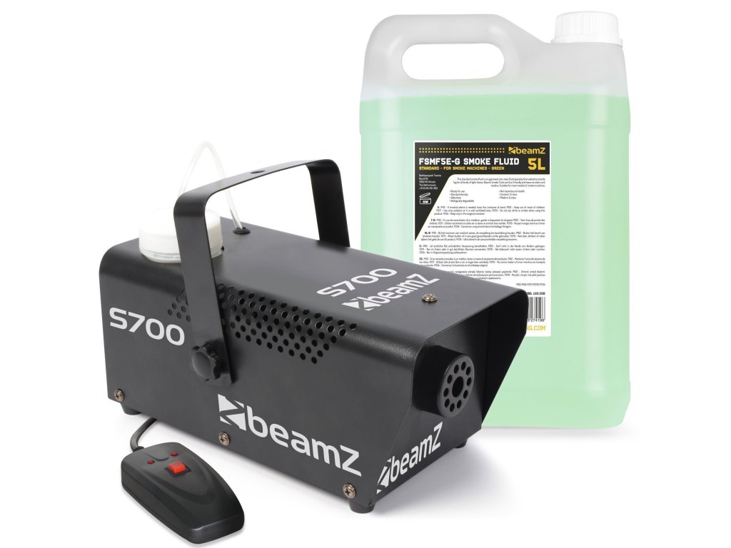 Výhodný set výrobníka hmly s náplňou BeamZ S700 700W a kvapaliny štandardnej hustoty BeamZ FSMF5E-G 5L.