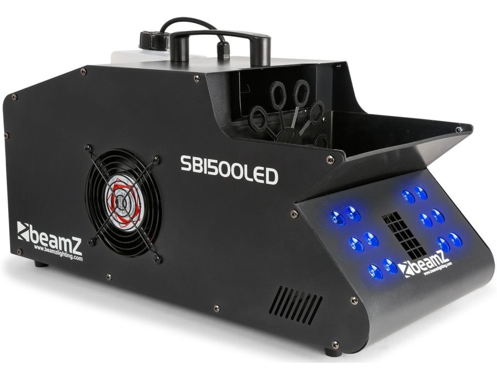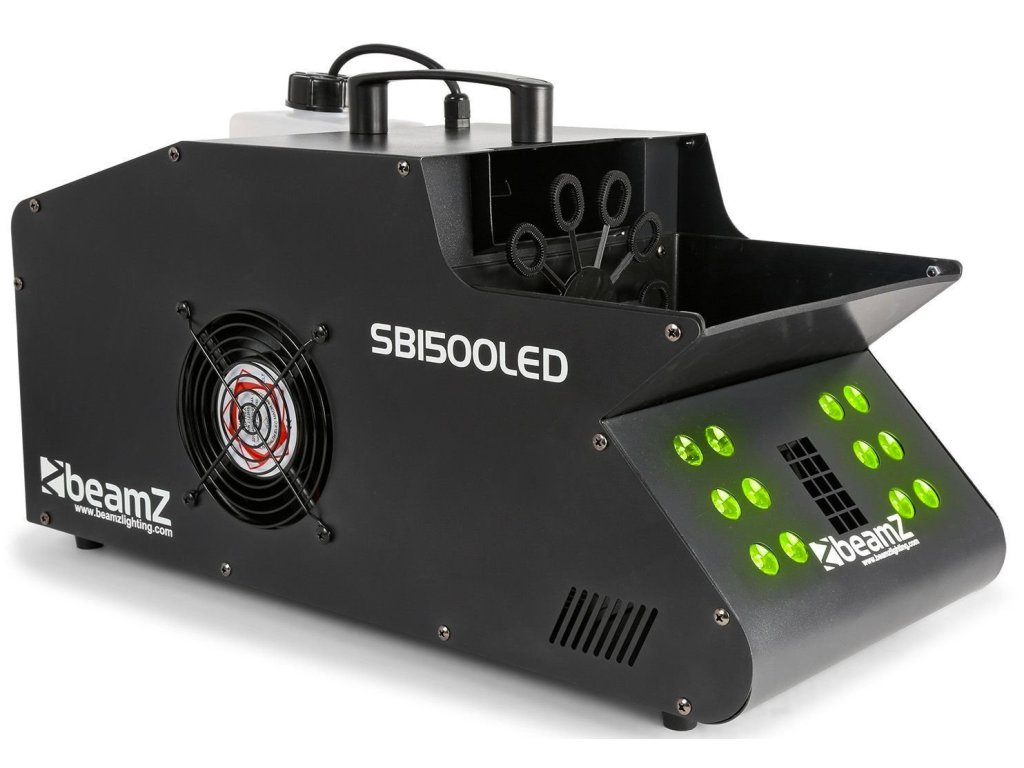 SB1500LED je kombinácia výrobníka hmly a bublín a LED diód 3v1 zabudovaných do jedného puzdra. Ventilátor stroja SB1500 vytvára mnoho bublín, ktoré sú každú minútu naplnené dymom, a zároveň vytvára vzostupný ťah, ktorý umožňuje bublinám stúpať vysoko do vzduchu. Tento systém má 12x 3W LED diódy vo farbách: červená, zelená a modrá. SB1500 sa ľahko používa a ľahko sa čistí. Na konci show nebudete mať problémy s upratovaním vďaka systému vypúšťacieho ventilu kvapaliny. SB1500 má 2 rukoväte a zabudované kolieska, ktoré uľahčujú prepravu. Hoci je SB1500 schopný používať väčšinu typov bublinkových tekutín, je najvhodnejšie používať s kvapalinami Beamz Bubble Liquid (160.575) a Beamz Smoke (160.582) pre najuspokojivejšiu a najkvalitnejšiu bublinkovú zábavu.