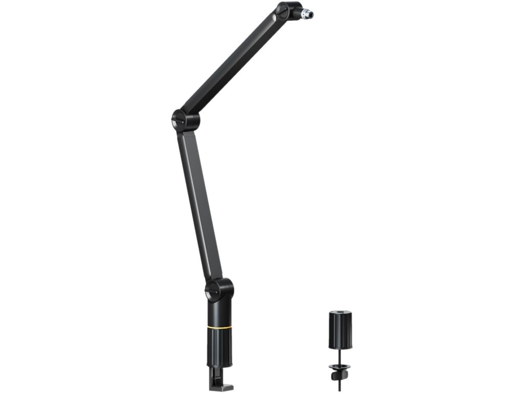 Prémiový mikrofónny stojan vhodný pre všetkých kreatívcov a nadšencov do audio záznamu, ďalej pre študentské rádiá, live broadcasting alebo youtubering. Stojan je vyrobený kombináciou ocele, plastu a hliníka, disponuje integrovaným káblovým managementom, možnosťou otáčania o 360 stupňov a v neposlednom rade pohodlným nastavením sklonu a výšky. Stojan pripevníte prostredníctvom skrutkového závitu na stolnú dosku s výškou až 60 mm. Súčasťou balenia je závitová redukcia na 5/8“.
