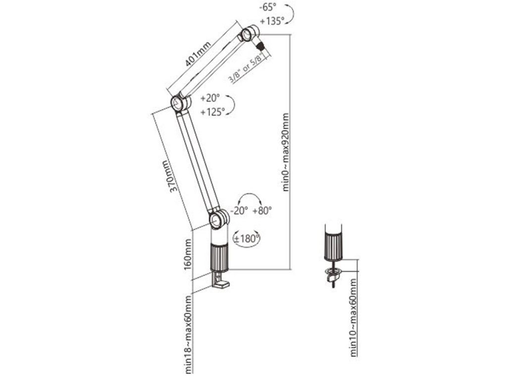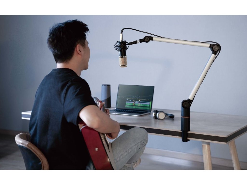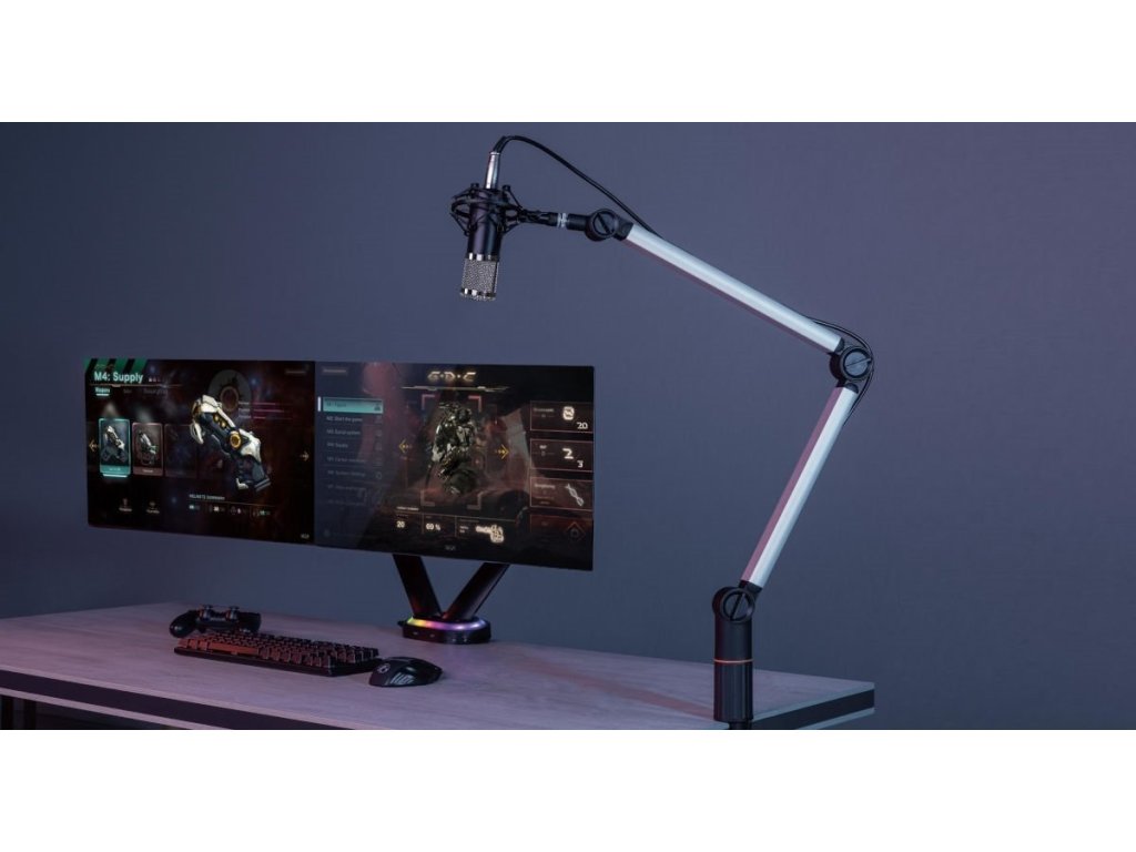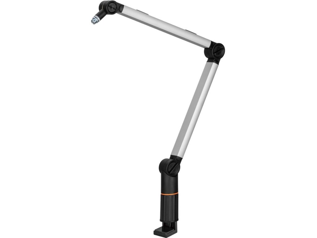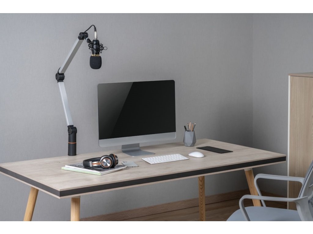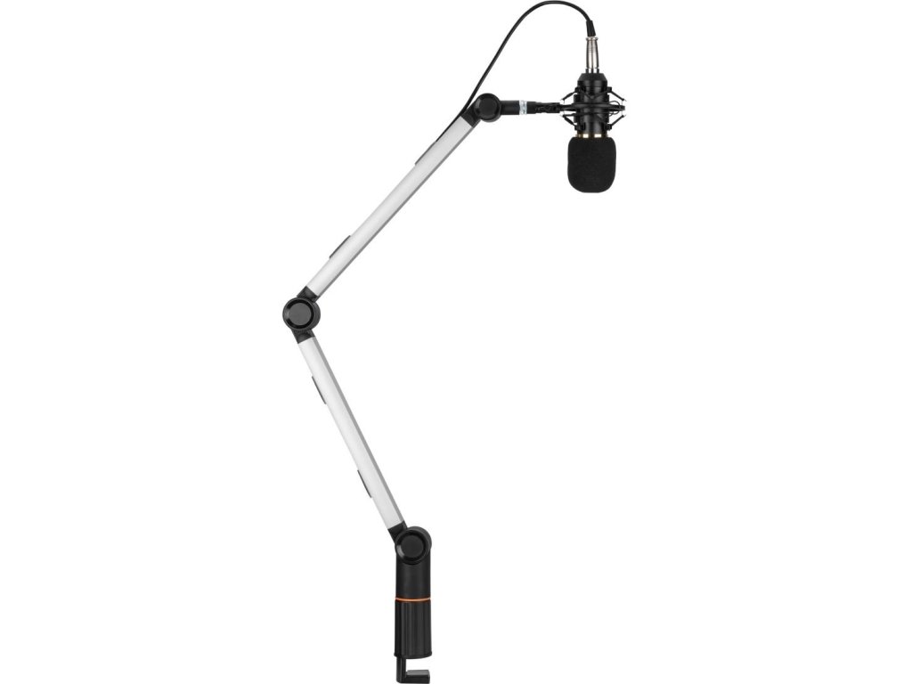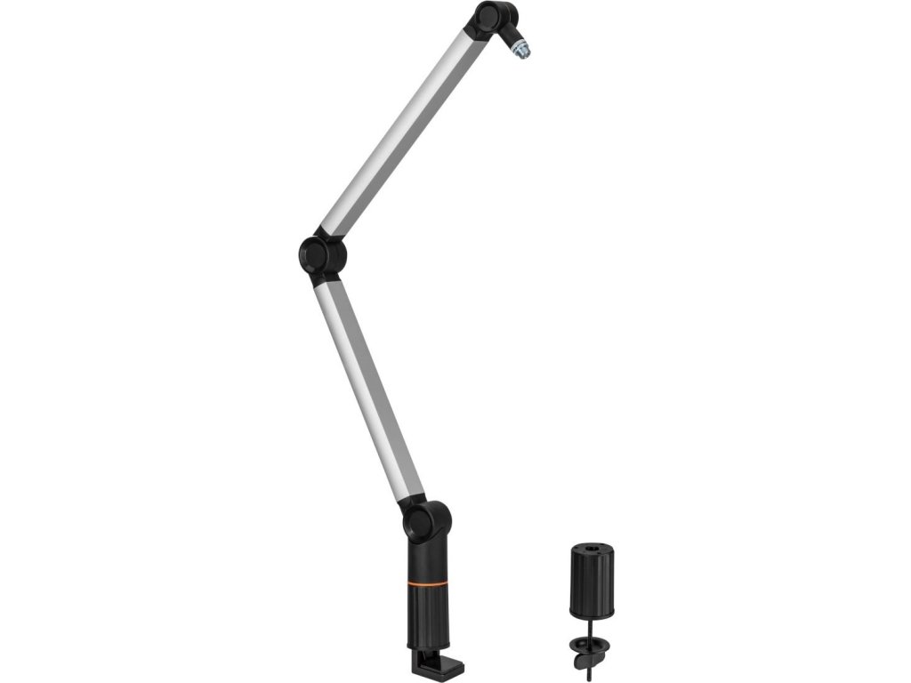 Prémiový mikrofónny stojan vhodný pre všetkých kreatívcov a nadšencov do audio záznamu, ďalej pre študentské rádiá, live broadcasting alebo youtubering. Stojan je vyrobený kombináciou ocele, plastu a hliníka, disponuje integrovaným káblovým managementom, možnosťou otáčania o 360 stupňov a v neposlednom rade pohodlným nastavením sklonu a výšky. Stojan pripevníte prostredníctvom skrutkového závitu na stolnú dosku s výškou až 60 mm. Súčasťou balenia je závitová redukcia na 5/8“.
