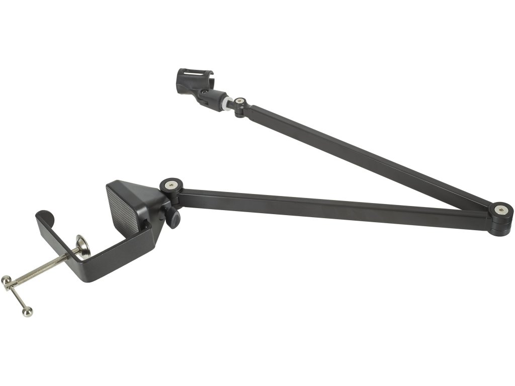 Stolný mikrofónny stojan s kovovou konštrukciou Mozos SB42 ponúka nosnosť až 2 kg, t. j. schopnosť operovať s profesionálnymi mikrofónmi, prichytenie k doske stola so šírkou až 7 cm, flexibilitu 40 + 40 cm dlhého ramena a široký set príslušenstva (štyri velcro pásky, mikrofónny držiak, držiak na telefón).