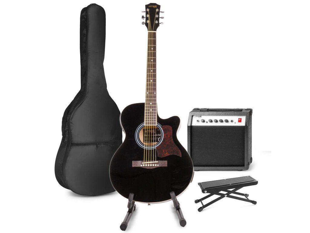MAX ShowKit obsahuje elektro-akustickú gitaru s oceľovými strunami, gitarové kombo a ďalšie príslušenstvo. Farba čierna.