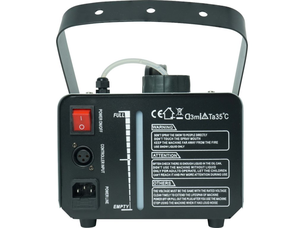Výrobník pracuje na báze bezpečnej snehovej kvapaliny na vodnej báze, čo z neho robí ideálnu voľbu pre vnútorné aj vonkajšie použitie (pod prístreškom). Nádrž s objemom 1 liter zaisťuje dlhú prevádzku bez nutnosti neustáleho dopĺňania. Trieda ochrany IP20 robí zariadenie ideálnym pre účely podujatí, pódiové a reklamné účely.