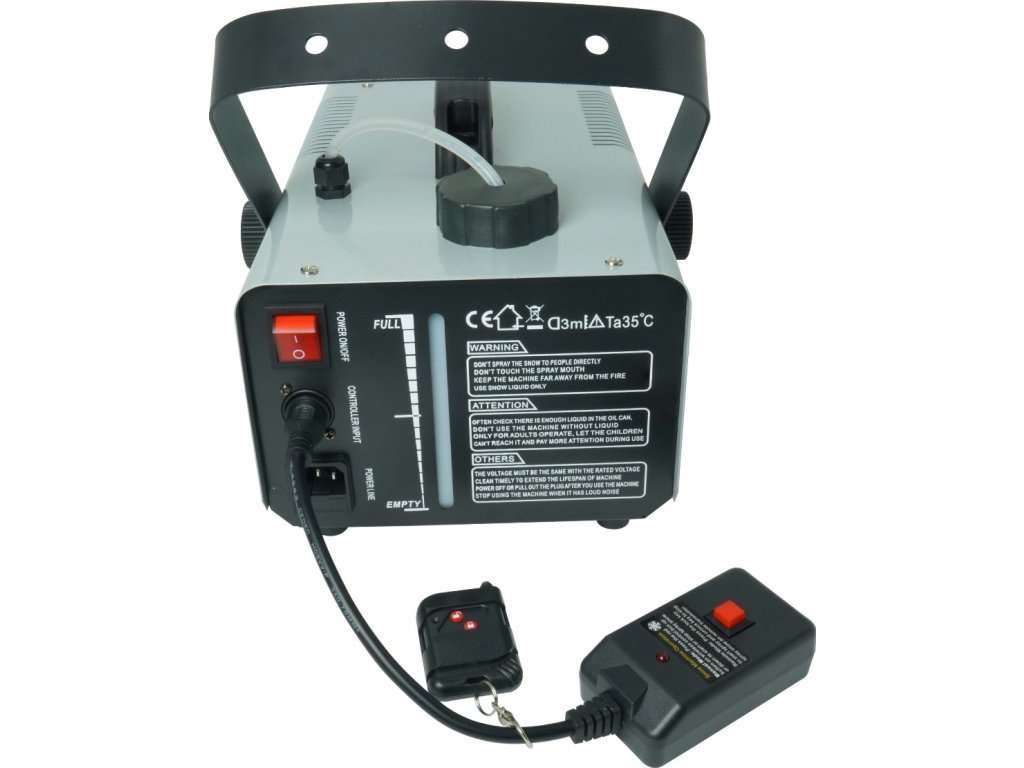 Ovládajte snehový efekt na diaľku pomocou IR ovládača alebo káblového ovládača – presne tak, ako vám to vyhovuje. Výrobník je vybavený vypínačom napájania a ukazovateľom hladiny kvapaliny, čo umožňuje bezpečné a intuitívne používanie. Vďaka robustnému montážnemu držiaku a rukoväti na prenášanie môžete zariadenie umiestniť kamkoľvek. Kompaktné rozmery a hmotnosť iba 3,1 kg uľahčujú transport aj pri intenzívnom harmonograme akcií.