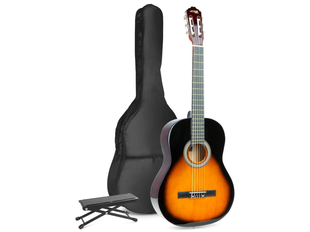 Výhodný set MAX SoloArt Klasické akustické gitary a príslušenstvo vo farbe Sunburst a MAX GP15 stoličky pre nohu gitaristu.