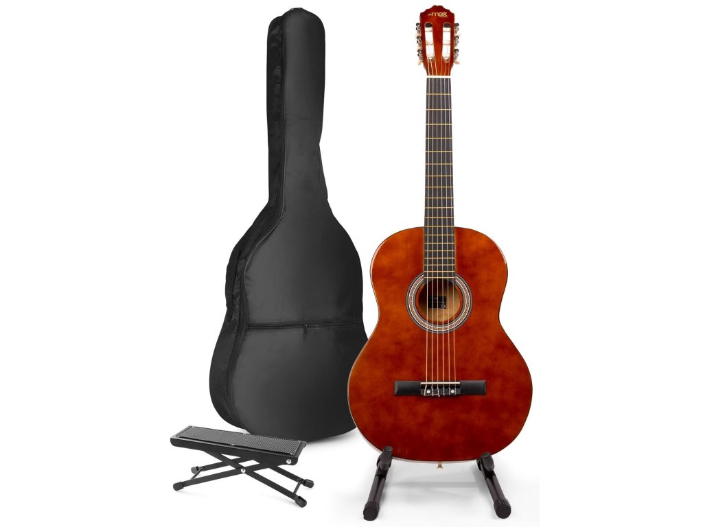 MAX SoloArt set obsahuje klasickú 4/4 gitaru s nylonovými strunami, obal na gitaru a príslušenstvo. Farba hnedá.
