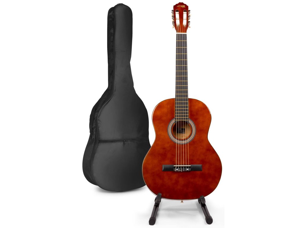 MAX SoloArt set obsahuje klasickú 4/4 gitaru s nylonovými strunami, obal na gitaru a príslušenstvo. Farba hnedá.