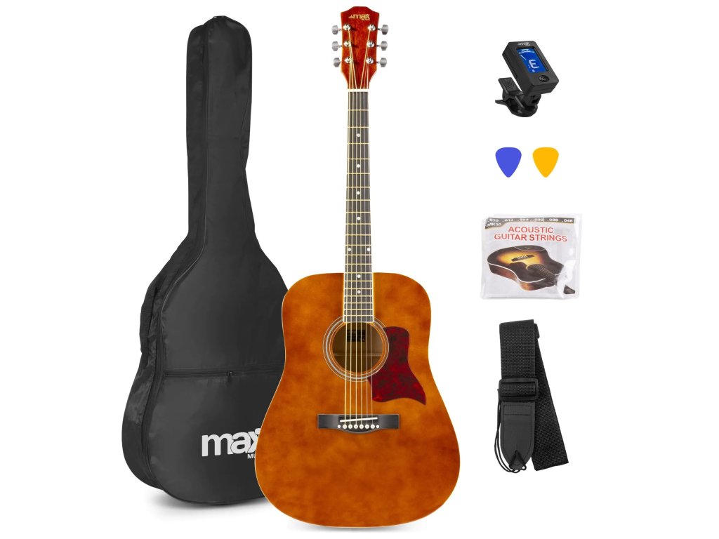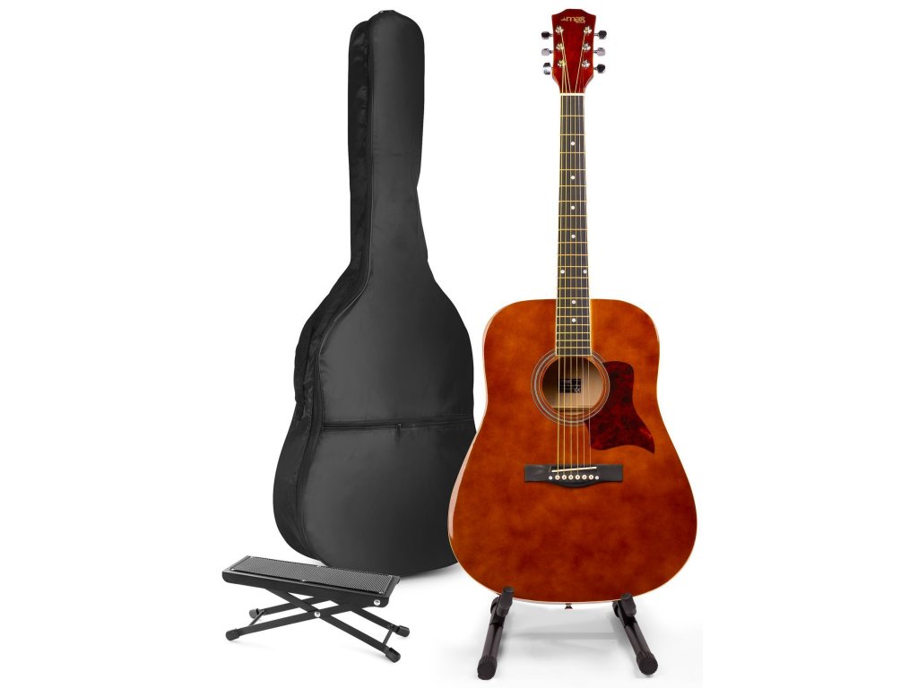 MAX SoloJam set obsahuje westernovú akustickú 4/4 gitaru s oceľovými strunami, obal na gitaru a príslušenstvo. Farba hnedá.