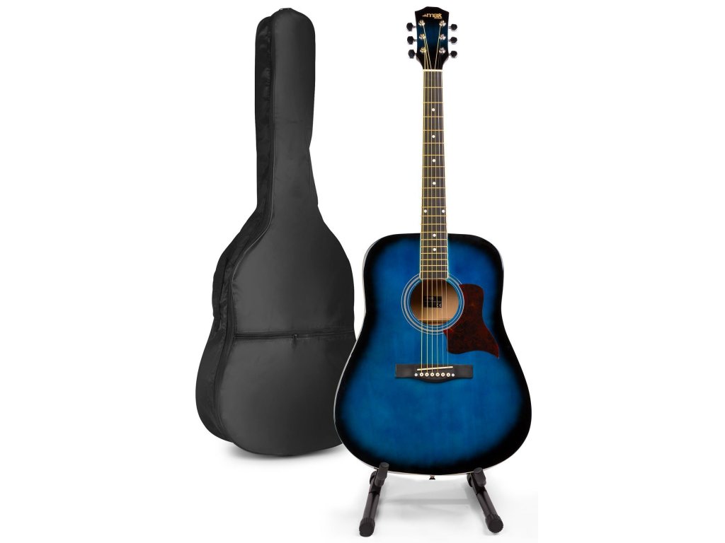 MAX SoloJam set obsahuje westernovú akustickú 4/4 gitaru s oceľovými strunami, obal na gitaru a príslušenstvo. Farba modrá.