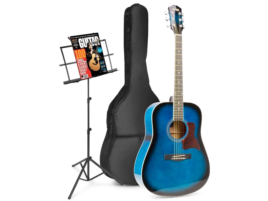 MAX SoloJam set obsahuje westernovú akustickú 4/4 gitaru s oceľovými strunami, obal na gitaru a príslušenstvo. Farba modrá.