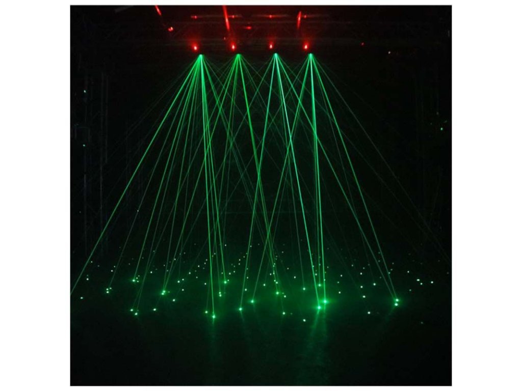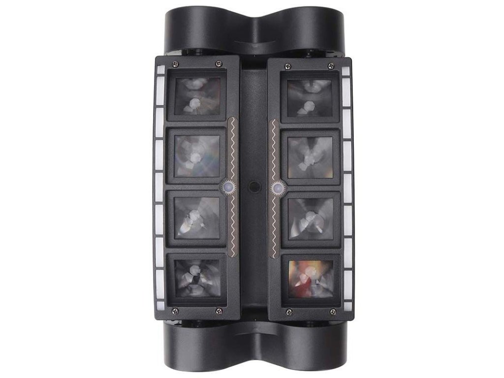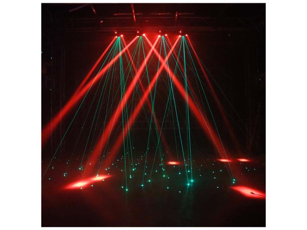 Multiefekt Spider je perfektný svetelný efekt na každú tanečnú párty! Zariadenie má dva paralelné LED lúče, ktoré sa môžu nezávisle pohybovať nakláňaním pozdĺž dlhšej osi. Na každom lúči sú 4 silné 10-wattové diódy vyžarujúce lúče vo farbách RGBW. Vonkajšie hrany každého lúča sú vybavené systémom prídavných LED pásikov a celok dotvára červený a zelený laser.