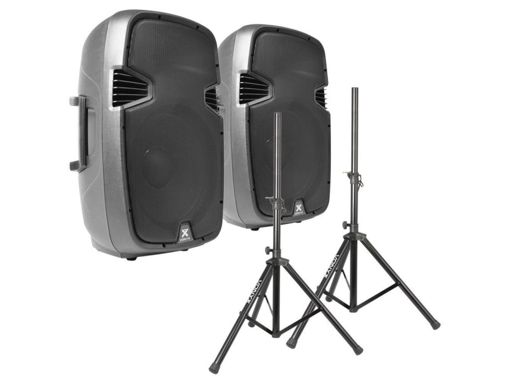 Výhodný set 2 aktívnych reproboxov Vonyx SPJ-1500A 15" 800W so stojanmi Vonyx LS01K Kit a prepojovacím káblom Power Dynamics CX35-12 12m.