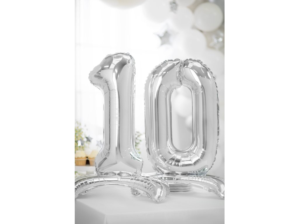 Stojaci balónik číslo ''0'' v striebornej farbe, veľkosť pred nafúknutím cca 90 cm (35''), veľkosť po nafúknutí cca 70 cm (27,5''). Nafúknite vzduchom.
