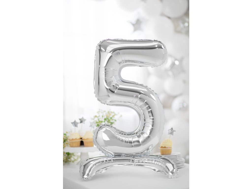 Stojaci balónik číslo ''5'' v striebornej farbe, veľkosť pred nafúknutím cca 90 cm (35''), veľkosť po nafúknutí cca 70 cm (27,5''). Nafúknite vzduchom.