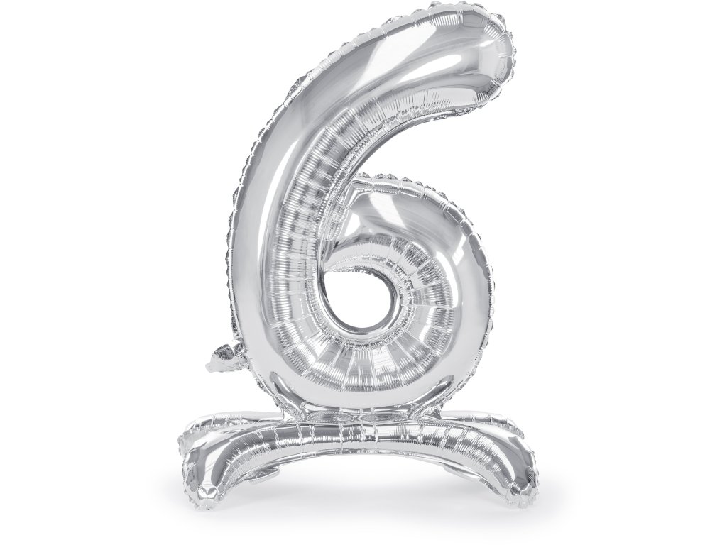 Stojaci balón číslo ''6'' v striebornej farbe, veľkosť pred nafúknutím cca 90 cm (35''), veľkosť po nafúknutí cca 70 cm (27,5''). Nafúknite vzduchom.