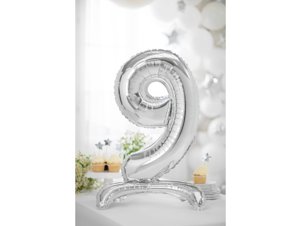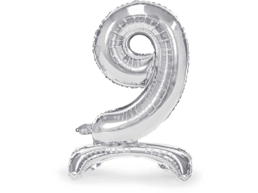Stojaci balónik číslo ''9'' v striebornej farbe, veľkosť pred nafúknutím cca 90 cm (35''), veľkosť po nafúknutí cca 70 cm (27,5''). Nafúknite vzduchom.