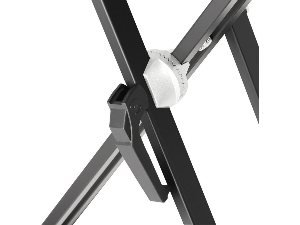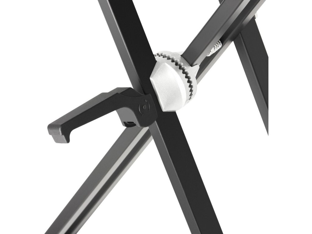 Stabilný stojan na klávesy s dvojitou výstuhou štvorcového prierezu a rýchlym nastavením.