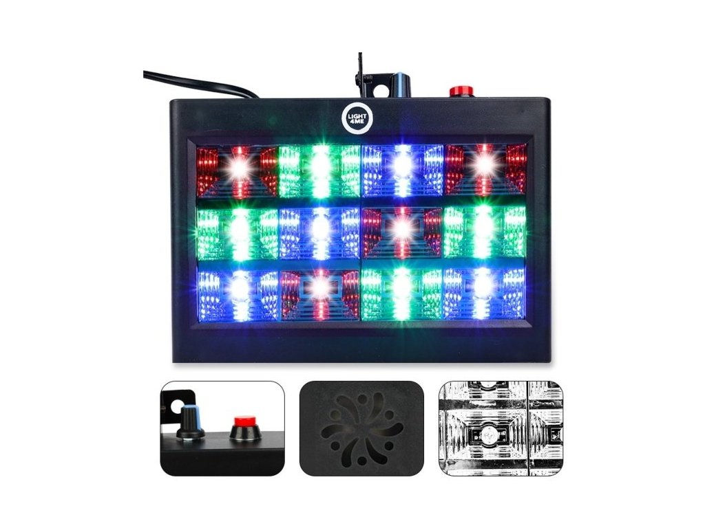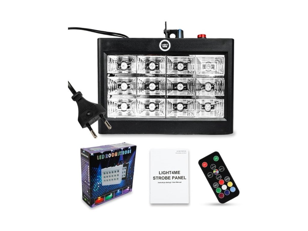 LIGHT4ME STROBE PANEL je profesionálny RGB stroboskop, ideálny pre diskotéky, kluby a malé pódiá, ktorý vďaka dvanástim 1W LED diódam a zrkadlovým tienidlám vytvára výrazné a dynamické svetelné efekty. Stroboskop ponúka tri prevádzkové režimy – automatický, zvukový a stroboskopický, pričom vstavaný mikrofón s nastaviteľnou citlivosťou umožňuje synchronizáciu svetelných efektov s rytmom hudby. Okrem toho je zariadenie vybavené potenciometrom na nastavenie citlivosti mikrofónu a frekvencie zábleskov, čo používateľom poskytuje plnú kontrolu nad svetelnou show.