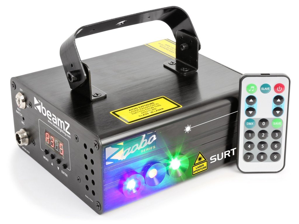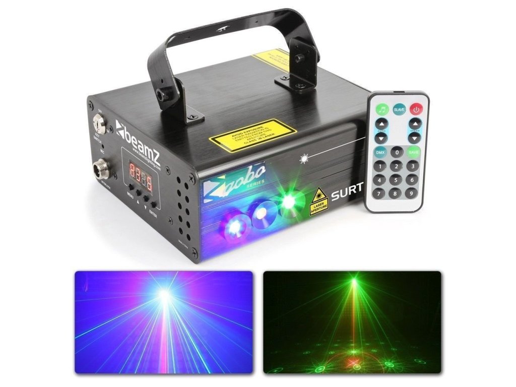BeamZ Surtur II vytvára atmosférický efekt z jedinečných červených a zelených laserových vzorov a modrého LED wash efektu, všetko zabudované do jedného puzdra. Môžete si vybrať z 8 rôznych gobo vzorov pre úžasný efekt. Červený a zelený laser je vybavený infračerveným diaľkovým ovládaním pre bezdrôtové ovládanie a prepínanie medzi zvukovo aktivovanými alebo automatickými programami. V DMX režime máte tiež úplnú kontrolu nad všetkými svetelnými vzormi. Surtur II je vybavený bezpečnostnými prvkami, ako je kľúčový spínač a interlock interface. Vďaka ľahkému dizajnu puzdra je ideálny pre mobilných djs, kapely, nočné kluby, bary a kohokoľvek, kto chce usporiadať večierok.