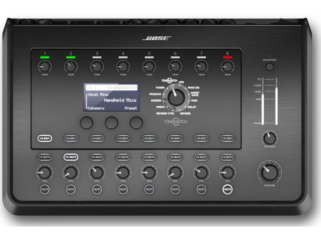 Ovládnite svoju hudbu pomocou mixážneho pultu T8S ToneMatch, kompaktného osemkanálového rozhrania určeného pre umelcov. T8S je vybavený výkonným DSP enginom a intuitívnym užívateľským ovládaním a ponúka ekvalizér, dynamiku a efekty štúdiovej kvality. Znie skvele vďaka integrovanému spracovaniu BoseToneMatch a zEQ, najmä po pripojení k systému Bose L1 alebo F1 pre úplnú komplexnú kontrolu tónov. S robustným modelom T8S môžete na pódiu hrať s istotou pomocou dotykových ovládacích prvkov, ľahko čitateľného LED displeja a funkcie vyvolania scény. T8S, skutočný spoločník umelca.