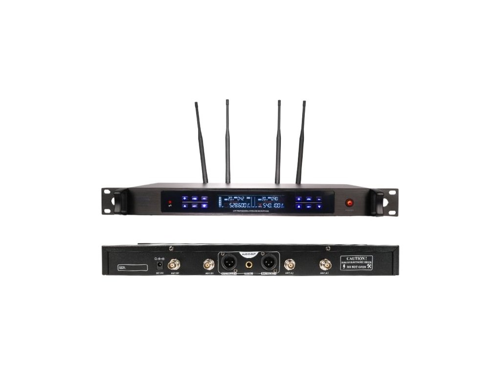 Druhou časťou systému DNA TDRV 2 je UHF prijímač s frekvenčným rozsahom 518 - 542 MHz. Na zadnej strane sú výstupy XLR pre kanály A a B, výstup 6,3 mm jack (1/4"), napájací konektor a štyri anténové konektory BNC. V prednej časti sa nachádza vypínač, tlačidlá na ovládanie hlasitosti, infračervený prijímač a dvojitý ovládací panel s LCD displejom. Ten zobrazuje aktuálne parametre systému, ako je úroveň RF/AF signálu, nastavenie frekvencie prijímača, zvolený prevádzkový kanál a či sú mikrofóny aktuálne zapnuté alebo vypnuté. Pomocou tlačidiel Up, Down a Set môžeme vykonať ručný výber frekvencie alebo vykonať automatické skenovanie, pri ktorom je systémovému zariadeniu priradená nerušená frekvencia.