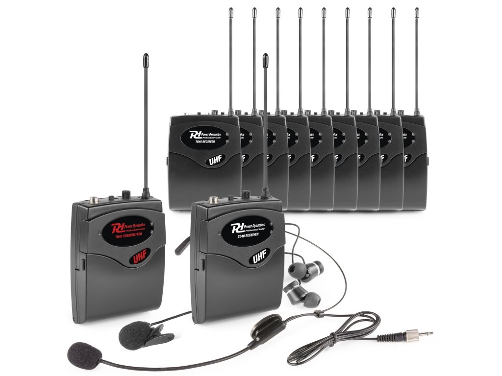 Výhodný set pre sprievodcu, tlmočenie alebo semináre, zložený zo sady vysielača s prijímačom a náhlavnou súpravou Power Dynamics TG40 a 9ks prijímačov so slúchadlami Power Dynamics TG40R.