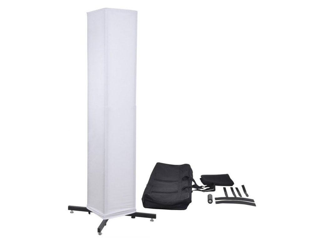 Stadn4Me Tower Set je pevná konštrukcia tvorená stĺpom, na ktorý môžete umiestniť rôzne typy svetelného vybavenia: otočné hlavy, výrobníky dymu alebo napríklad reproboxy. Rám veže je vyrobený z kovových profilov, ktoré môžu dosahovať výšku 85 až 165 cm. V hornej časti je plochá základňa s otvorom pre vedenie káblov a upevňovací bod pre stĺpový adaptér. Na stavbu môžeme nasadiť bielu alebo čiernu elastickú tkaninu. Stabilitu celej inštalácie zaisťuje široká základňa v tvare kríža vybavená nastaviteľnými nožičkami, ktoré umožňujú umiestnenie stĺpika na nerovný povrch. V strednej časti základne je tiež skrutka, vďaka ktorej môžeme do veže inštalovať dekoratívne osvetlenie.