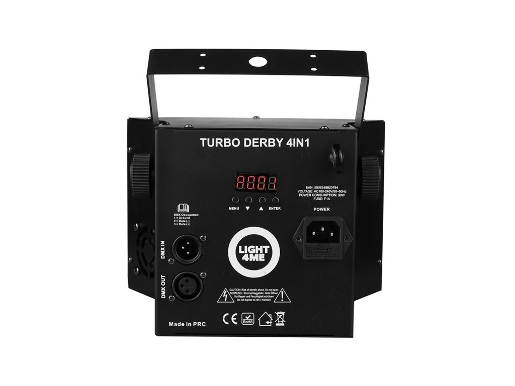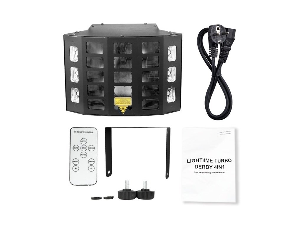 LIGHT4ME TURBO DERBY 4IN1 je kvalitný RGBW-UV LED svetelný multiefekt. Vďaka výkonnému svetelnému zdroju, ktorý sa skladá z dvoch RGBW LED diód po 15 wattoch, šiestich UV+W LED diód po 6 wattoch, červeného lasera (120 mW) a zeleného lasera (30 mW), ponúka jasné a pútavé vizuálne efekty, ktoré uspokoja potreby aj tých najnáročnejších používateľov. Vďaka nízkej spotrebe energie je zariadenie energeticky úsporné, čo je dôležitá výhoda pre dlhotrvajúce akcie. Úzky uhol lúča umožňuje vynikajúce osvetlenie vybraných oblastí, čo je neoceniteľné na miestach, ako sú malé kluby a svadobné sály.