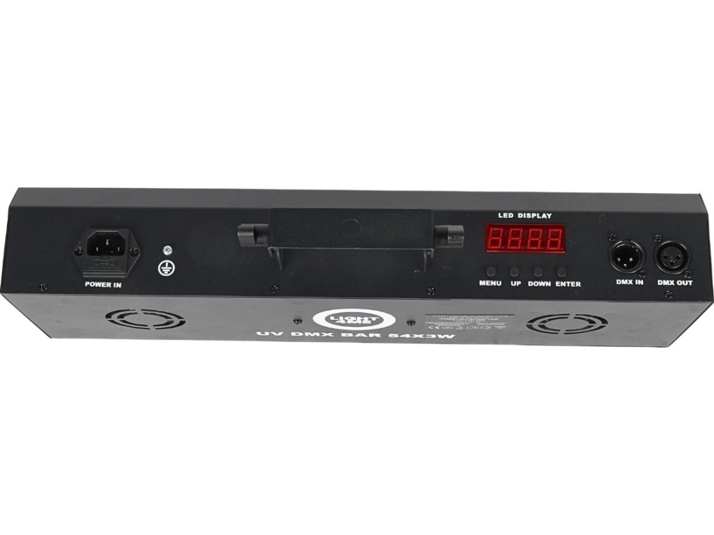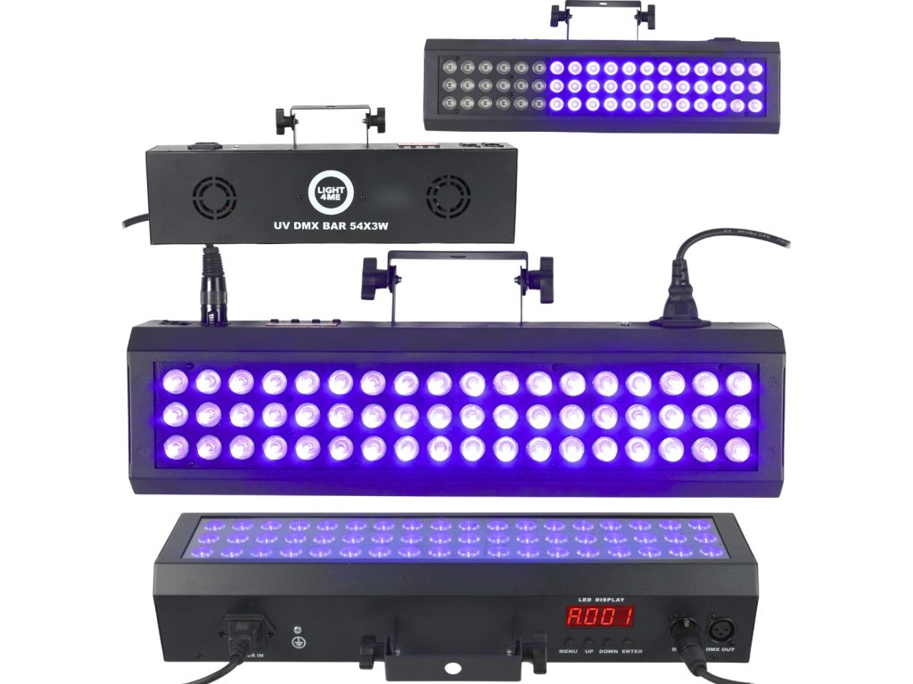 Vďaka 54 UV LED diódam s výkonom 3 W generuje Light4Me UV DMX Bar pútavé ultrafialové žiarenie, ktoré je ideálne na zvýraznenie fluorescenčných prvkov, bodypaintingu alebo klubových dekorácií. Používateľ má k dispozícii režimy auto, DMX, master/slave a sound, a tiež až 20 hotových programov v režimoch auto/sound, pri ktorých možno nastaviť tempo (auto) a citlivosť mikrofónu (sound). Toto osvetlenie poskytuje plnú tvorivú slobodu a možno ho prispôsobiť akémukoľvek typu udalosti.