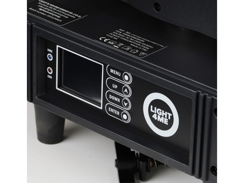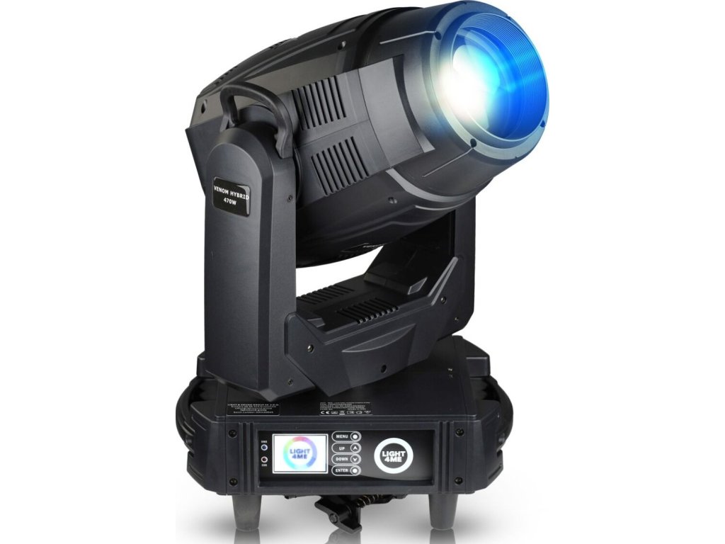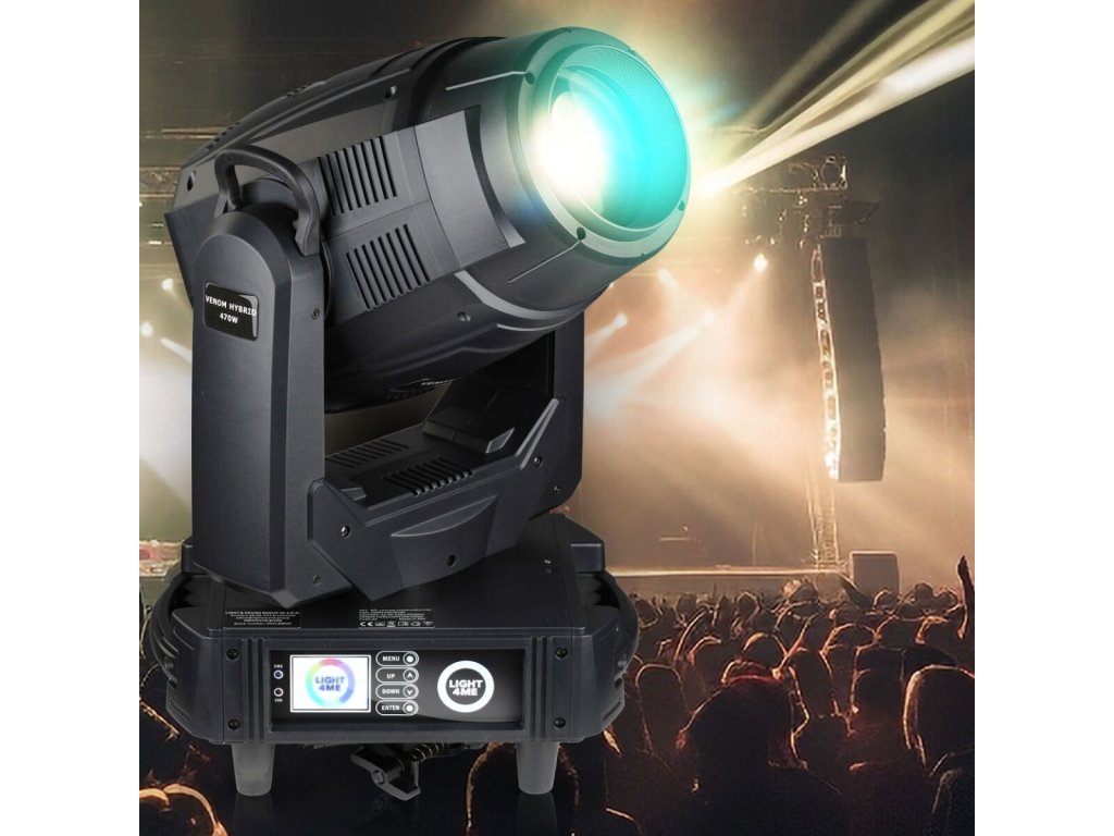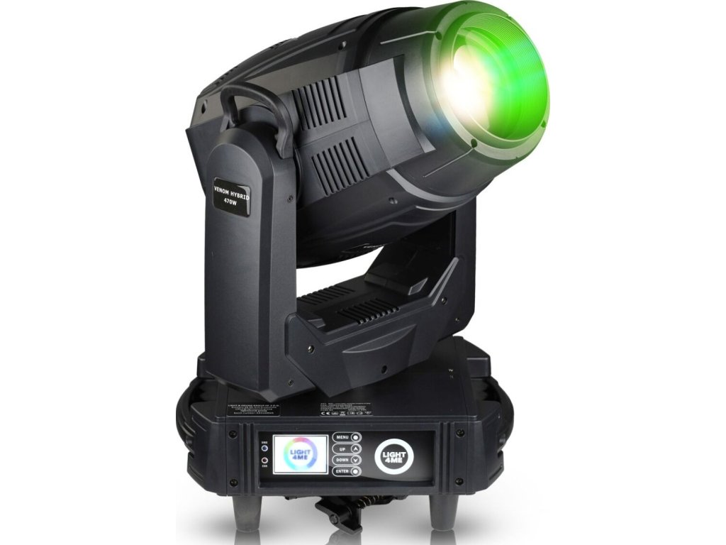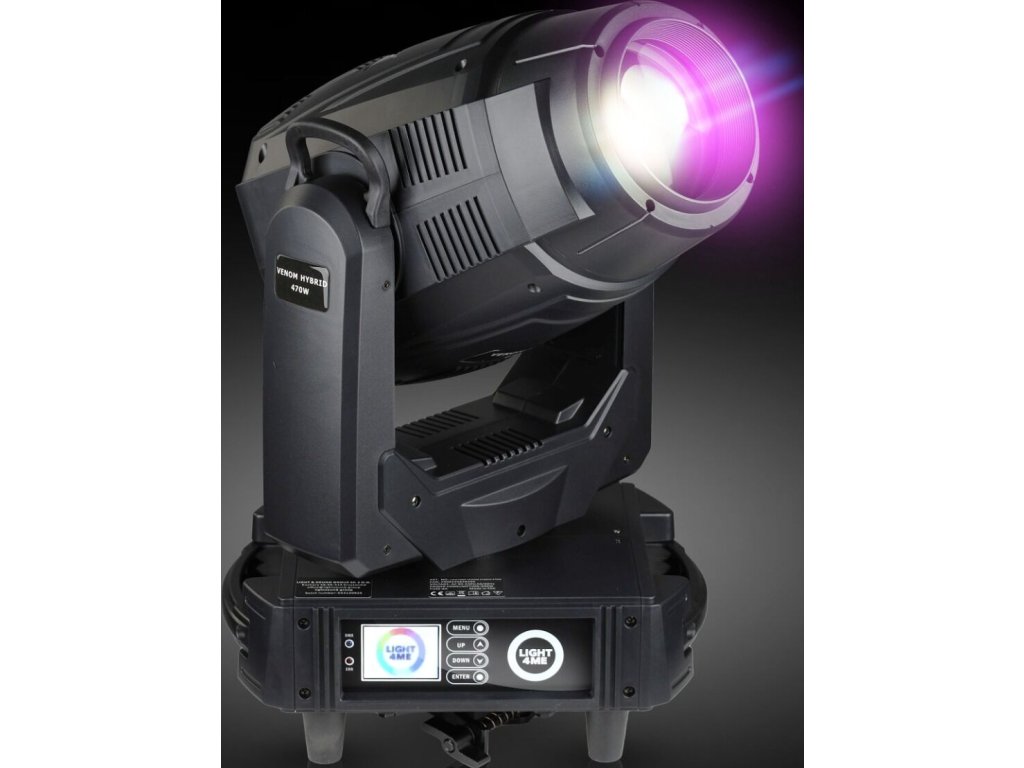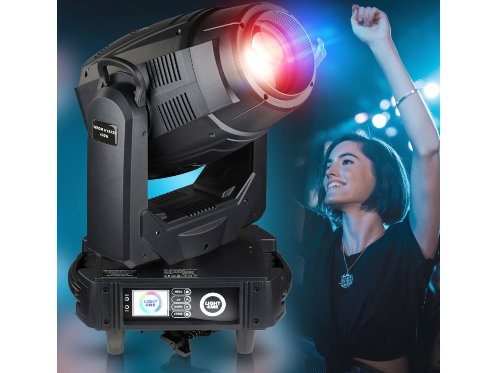 Light4Me Venom Hybrid 470W je pokročilé pódiové DMX osvetlenie, ktoré bolo navrhnuté s ohľadom na koncerty, vonkajšie akcie, hudobné kluby, divadlá, kultúrne domy a rentalové firmy, ktoré očakávajú precíznosť, veľkolepé efekty a plnú kontrolu nad svetlom. Vďaka bielej LED dióde s výkonom 470W, elektronickému zoomu 3–35° a rozsiahlym optickým efektom sa toto svietidlo osvedčuje ako na veľkých pódiách, tak v komornejších realizáciách.