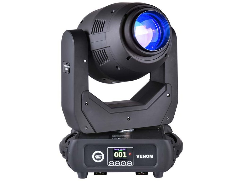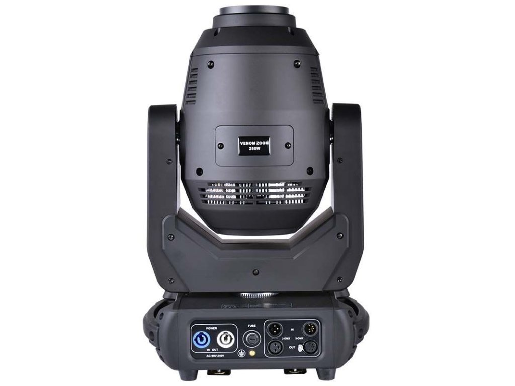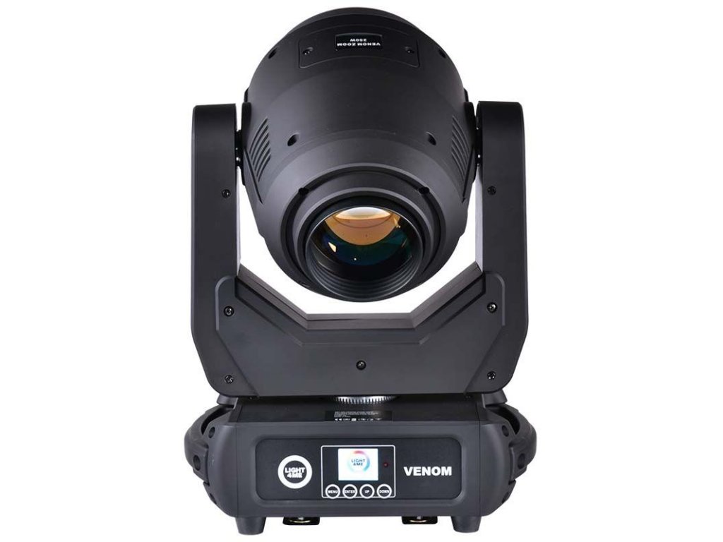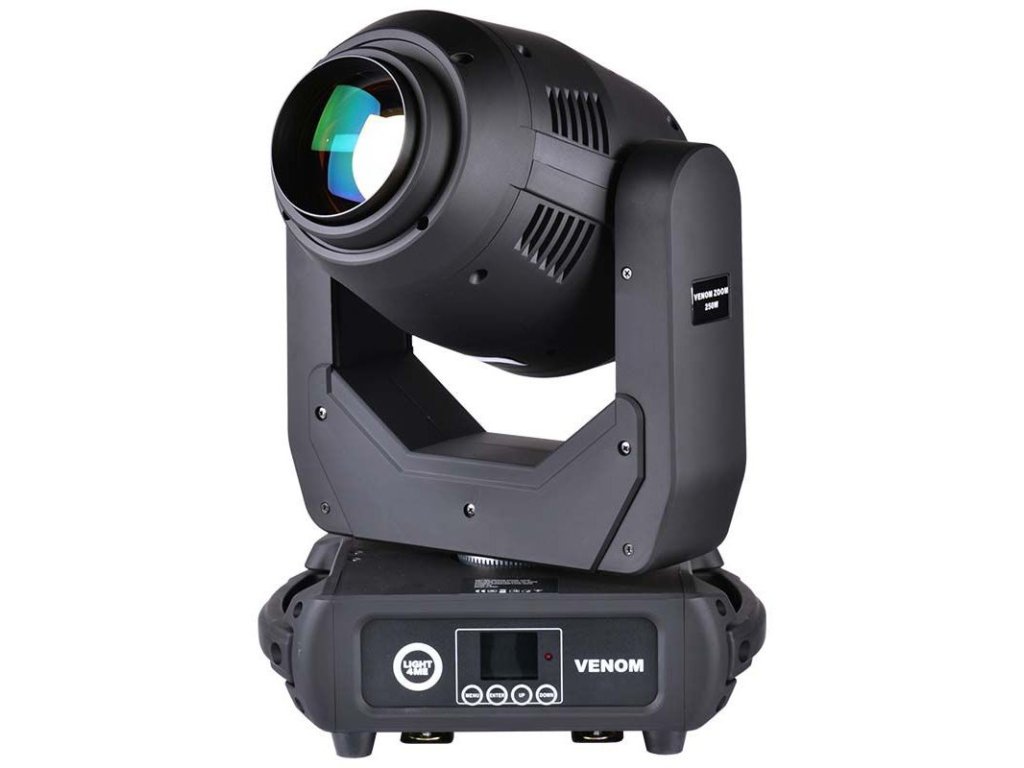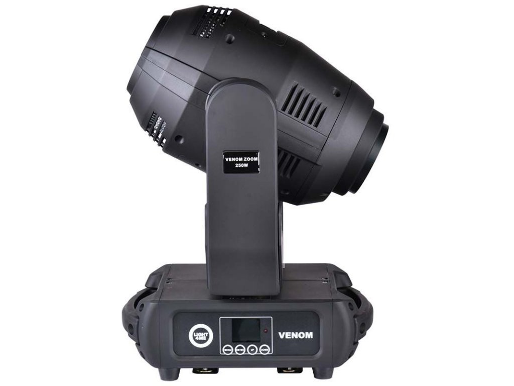 Light4Me Venom Zoom 250W V2 je vynikajúca hybridná pohyblivá hlava. Jej elektronické súčiastky sú uzavreté v pevnom ohňovzdornom puzdre. Je vybavená držiakmi pre jednoduché prenášanie a montáž zariadenia na truss konštrukcie a osvetľovacie rampy. Vo výbave nájdete farebné koleso so 7 farbami, gobo kolesá so statickými a rotačnými gobo s celkom 15 vzormi pre tvarovanie lúča, frost filter a 8-fazetový rotačný prisma hranol pre rozdelenie svetelného lúča.