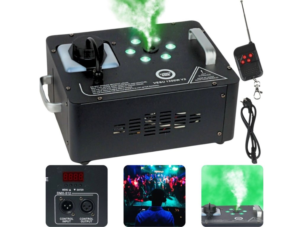 Ovládanie je veľmi jednoduché – stačí použiť priložený bezdrôtový infračervený ovládač alebo prehľadný panel s LED displejom a štyrmi tlačidlami. Zariadenie je možné bez problémov integrovať do existujúceho osvetľovacieho systému vďaka štandardným dátovým konektorom DMX in/out. Možnosť nastavenia časových intervalov medzi výfukmi a svetelných efektov, ako sú tri statické farby, stroboskop alebo farebný prechod s nastaviteľnou rýchlosťou, umožňuje presné prispôsobenie prevádzky zariadenia charakteru vašej akcie. Light4Me VESU 1200W V2 je vybavenie, ktoré nadchne profesionálov aj začínajúcich pódiových technikov.