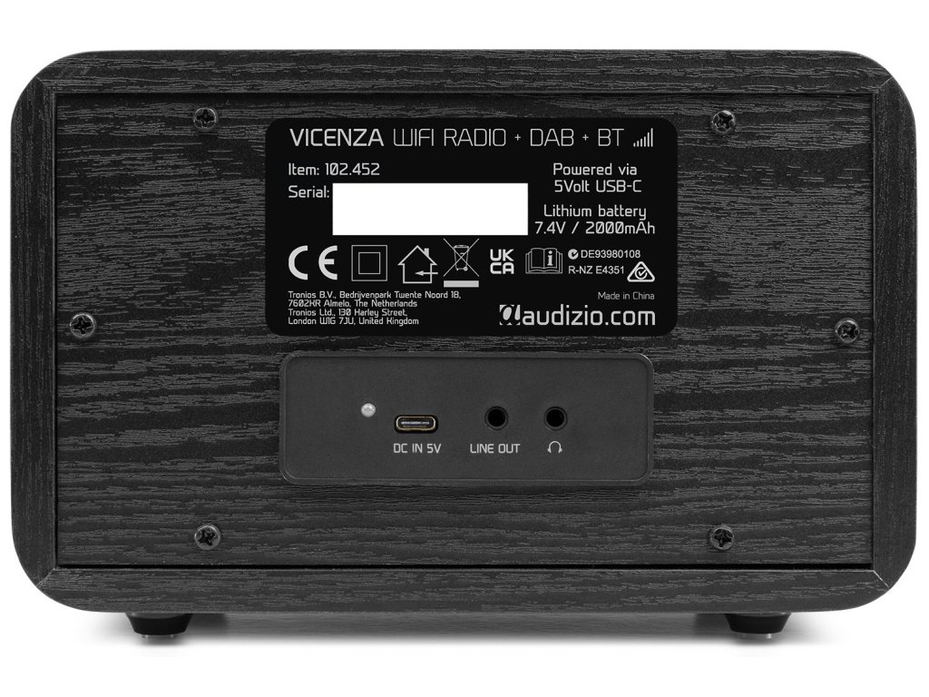 Wi-Fi rádio Vicenza je multifunkčné digitálne rádio so vstavanou batériou a ponúka vám viac ako 32000 internetových rádií z celého sveta. Svoje obľúbené melódie môžete tiež počúvať na rádiu DAB+, ktoré ponúka stanice s vysoko kvalitným signálom. Počúvajte svoje obľúbené rozhlasové stanice na bežnom FM rádiu, keď ste mimo oblastí digitálneho vysielania, a s bezdrôtovou technológiou Bluetooth prehrávajte hudbu priamo z inteligentného zariadenia do tohto digitálneho rádia. Modely Vicenza majú veľký farebný LCD displej, ktorý zobrazuje vybranú rozhlasovú stanicu a tiež aktuálny program, správy a informácie o počasí, ak ich prevádzkovateľ stanice poskytuje. Vstavaná batéria vám zaistí až 10 hodín prehrávania na jedno nabitie.
