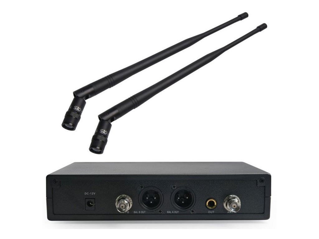 Druhou časťou systému je prijímač s frekvenčným rozsahom 518 až 542 MHz. Na zadnej strane skrine sú XLR výstupy pre kanály A a B, zásuvka jacku (1/4 "), zásuvka napájacieho zdroja a dva konektory antény BNC. V prednej časti je umiestnený vypínač, dva potenciometre, infračervený prijímač a duálny ovládací panel s LCD displejom. Zobrazuje aktuálne systémové parametre, ako je úroveň signálu RF / AF, nastavenie frekvencie prijímača, zvolený prevádzkový kanál a či sú mikrofóny aktuálne zapnuté alebo vypnuté. Pomocou tlačidiel Hore, Dole a Nastaviť môžete ručne vybrať frekvenciu alebo vykonať automatické skenovanie, počas ktorého bude neprerušovaná frekvencia automaticky priradená systémovým zariadeniam.