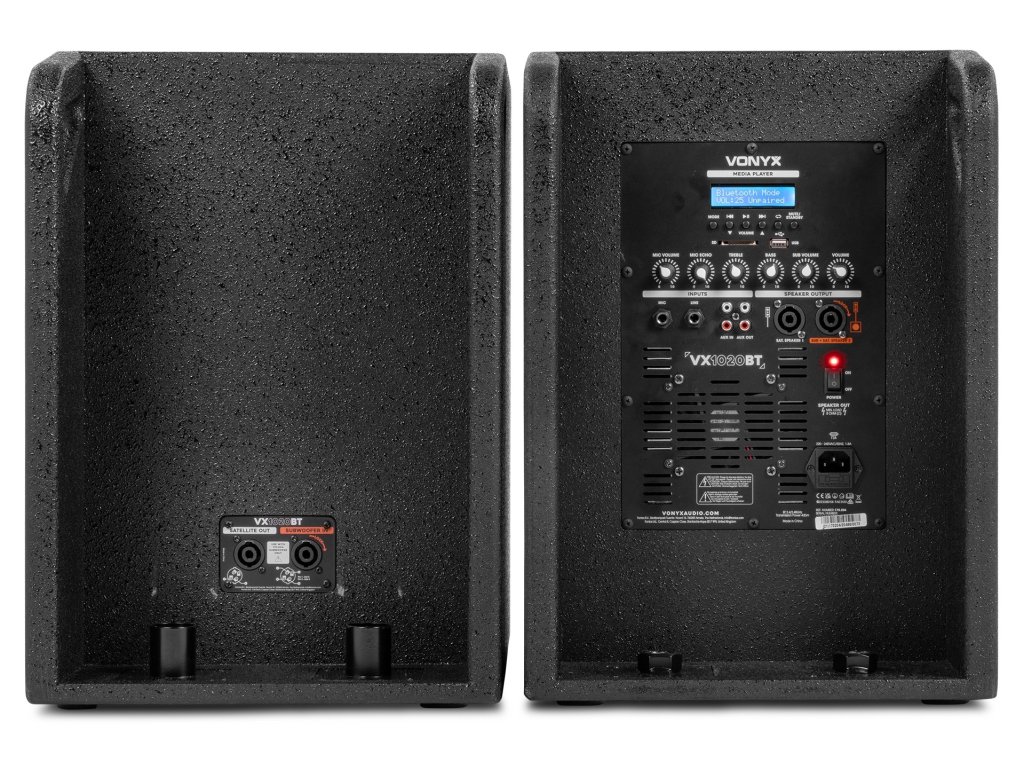 VX1020BT je kompletná súprava reproduktorov typu plug & play. Všetko, čo potrebujete na spustenie, je súčasťou balenia. V jednom 10" subwooferi je zabudovaný zosilňovač, ktorý napája celý systém. Horné reproduktory aj pasívny subwoofer sú pripojené k jednotke so zosilňovačom. Vstavaný prijímač Bluetooth vám umožňuje ľahko streamovať hudbu bezdrôtovo zo smartfónu alebo môžete použiť vstavaný MP3 prehrávač so slotmi USB a SD.