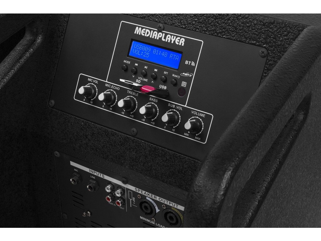 VX1050BT je kompletná sada reproduktorov typu Plug & Play. Všetko, čo potrebujete na začatie, je dodávané v balení. Všetok výkon pochádza z jediného 12" subwoofera, v ktorom je umiestnený zosilňovač, ako vrchný, tak aj pasívny subwoofer sú pripojené k zosilňovacej jednotke. Vstavaný prijímač BT umožňuje jednoducho streamovať hudbu bezdrôtovo zo smartfónu alebo môžete použiť vstavaný MP3 prehrávač s USB a SD slotmi.