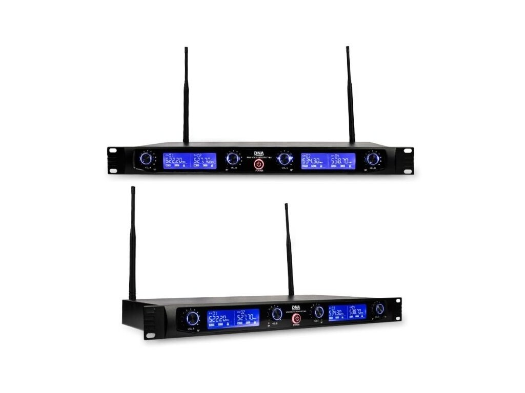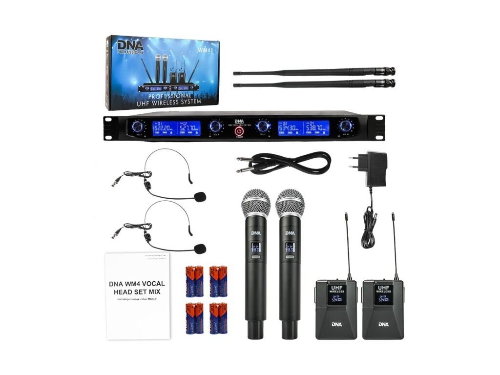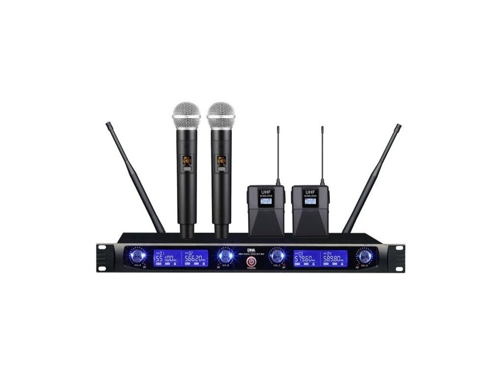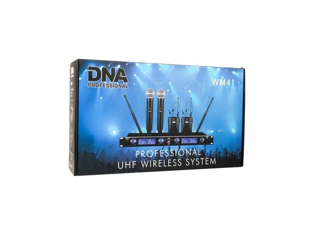 DNA WM4 VOCAL HEAD SET MIX je profesionálny bezdrôtový mikrofónny systém, ktorý obsahuje dva bezdrôtové ručné dynamické mikrofóny, dva bezdrôtové hlavové dynamické mikrofóny s bodypack vysielačmi a základňovú stanicu s farebným LCD displejom, ktorá je kompaktným prijímačom UHF.